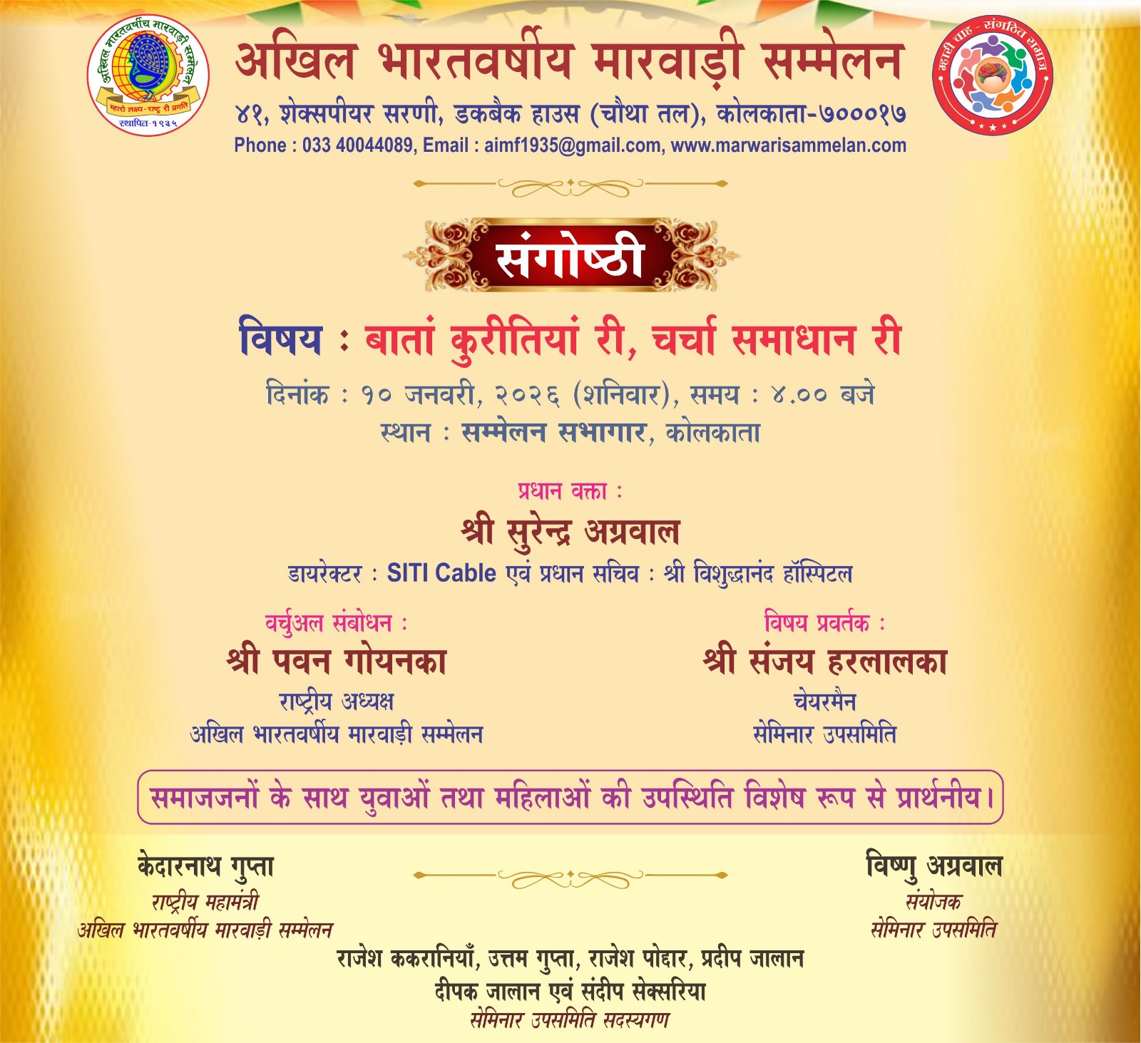 91st Foundation Day ceremony will be held on 25th December 2025 (Thursday) by All India Marwari Federation. Your gracious presence, alongwith family and friends, is solicited.