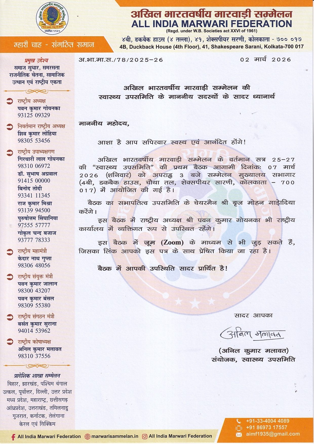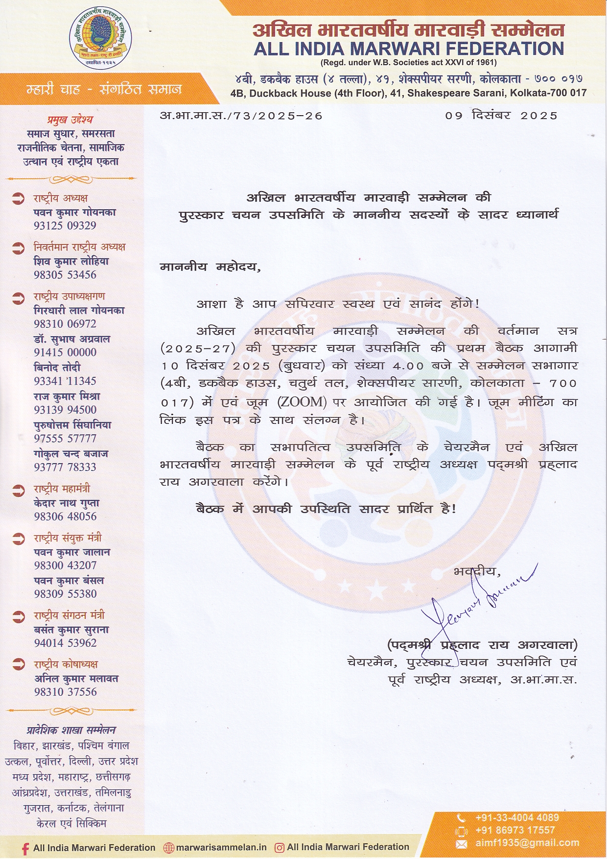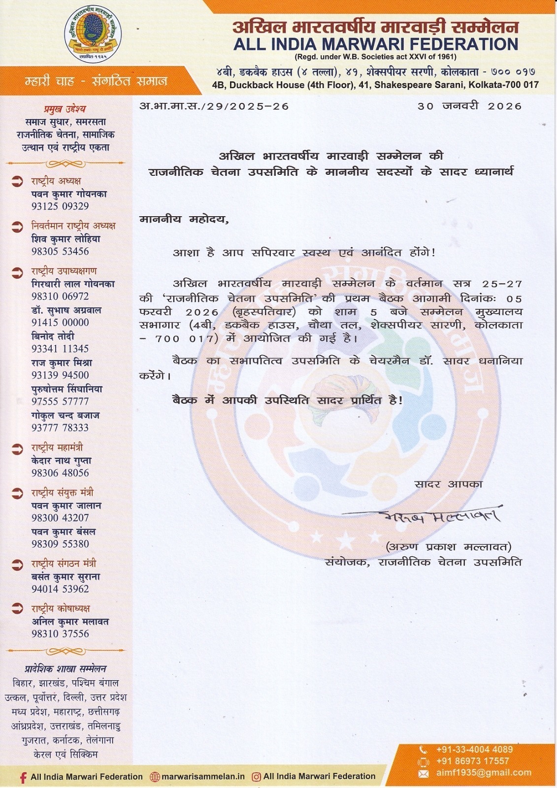 National Executive Committee Session 2025-27, 1st Meeting will be held on 17 January 2026, at 11.00 AM, Marwari Bhawan Parisar, Harmu Road, Ranchi-834001, Jharkhand