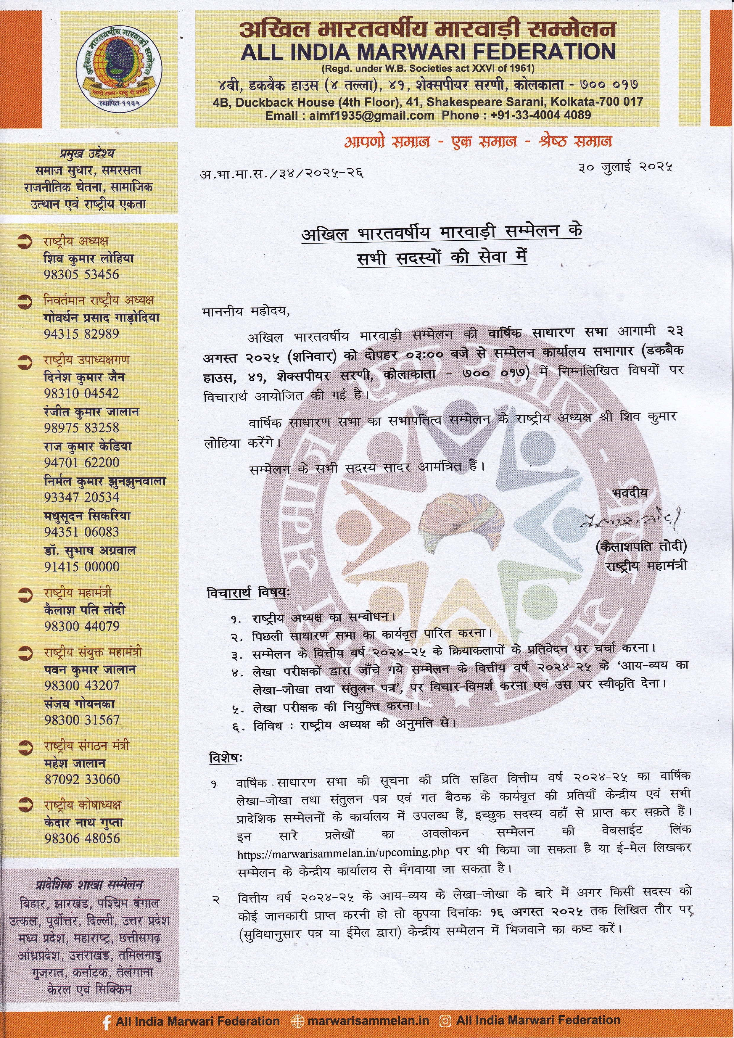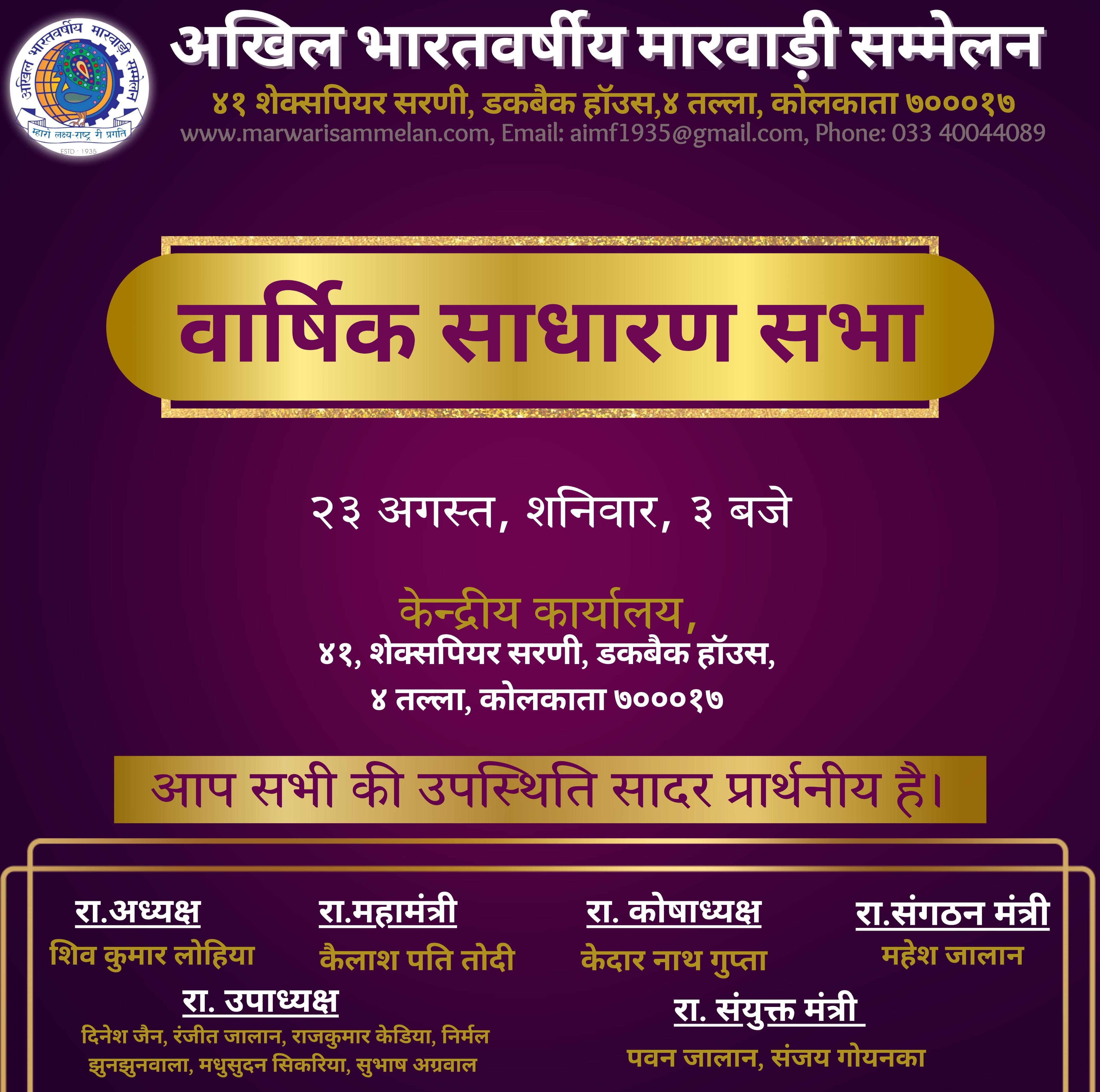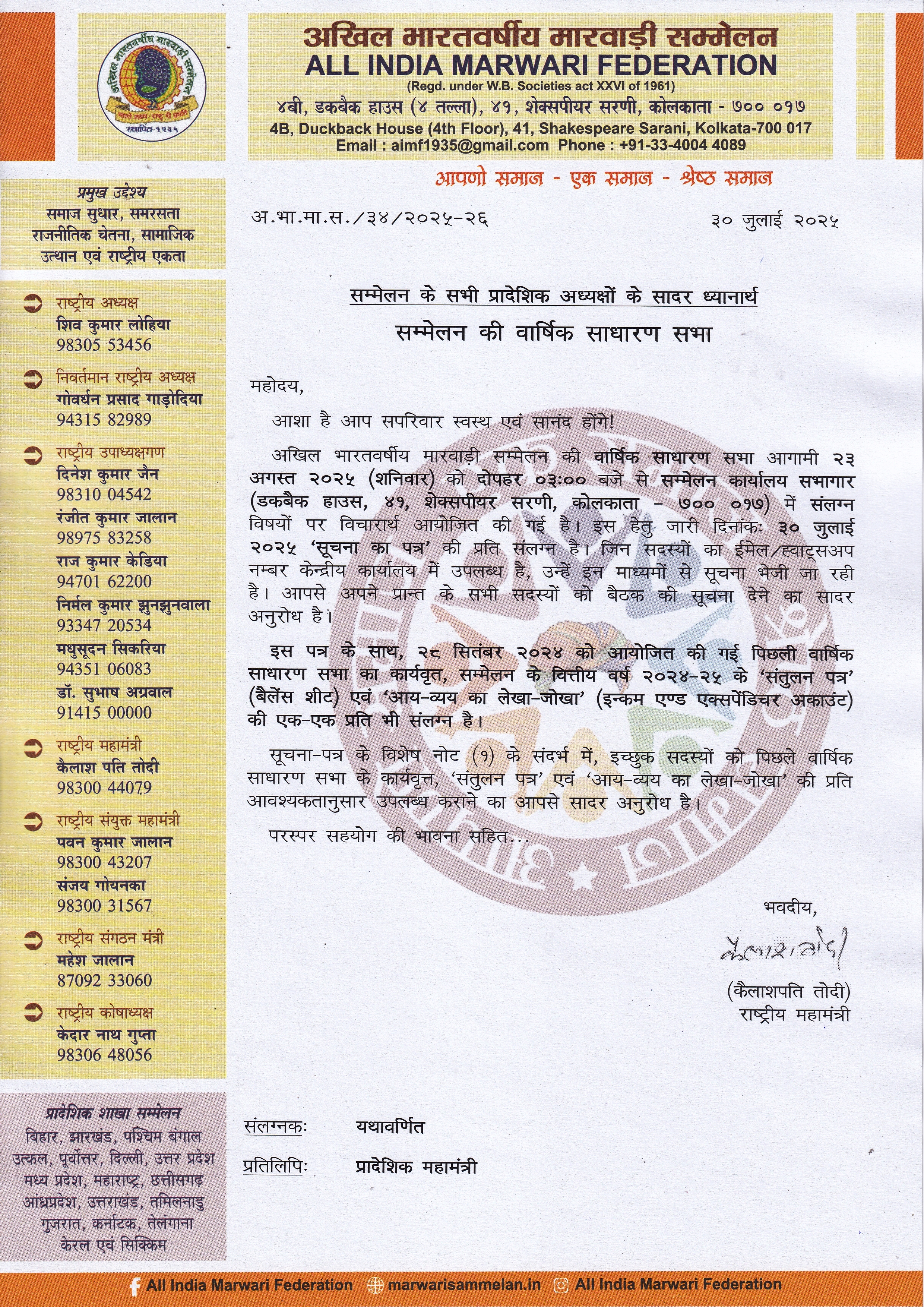 मान्यवर सदस्यगण, अखिल भारतवर्षीय मारवाड़ी सम्मेलन की आगामी सत्र हेतु राष्ट्रीय अध्यक्ष के चुनाव संबंधित सूचना । राष्ट्रीय कार्यालय अखिल भारतवर्षीय मारवाड़ी सम्मेलन कोलकाता
