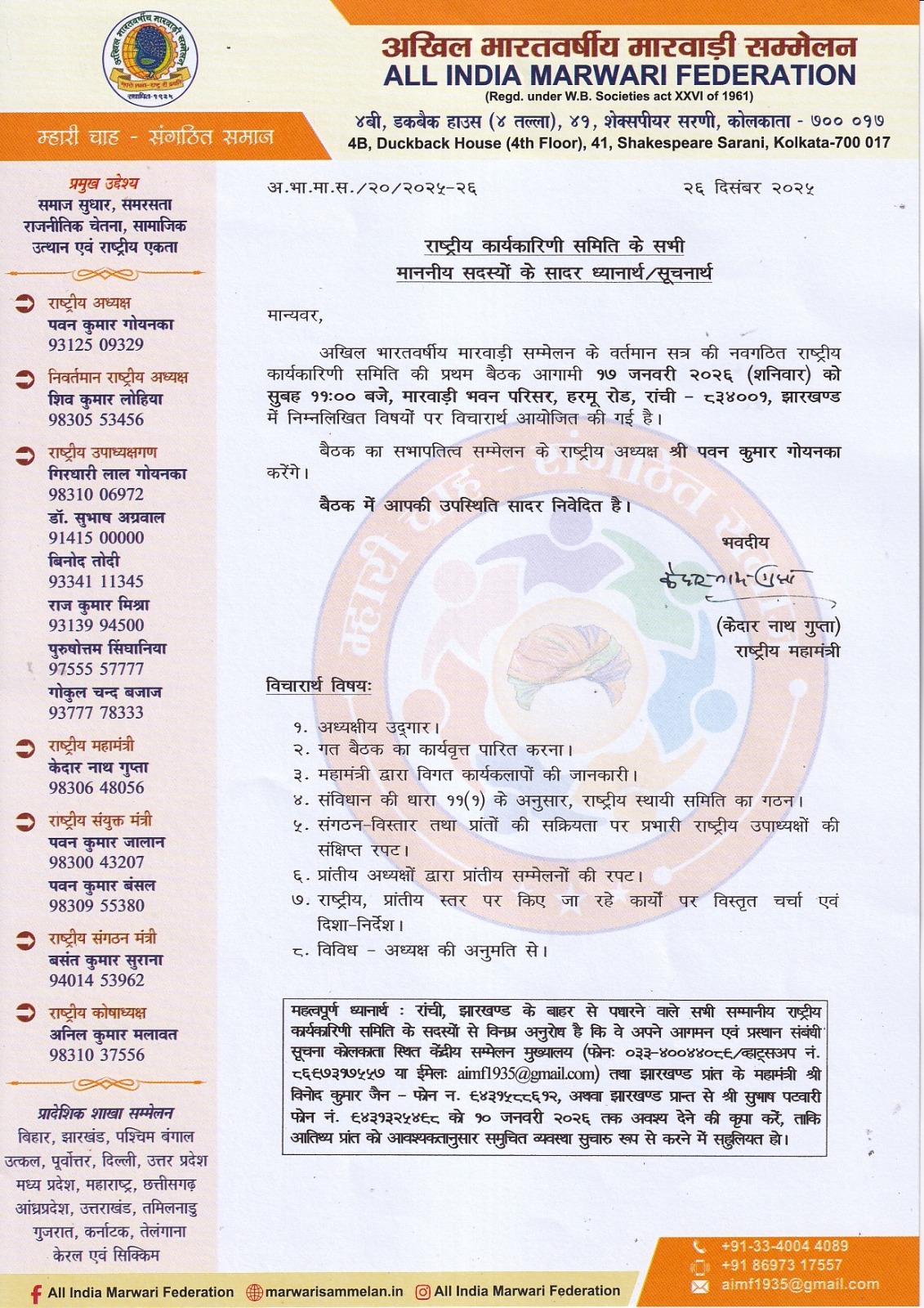 National Executive Committee Session 2025-27, 1st Meeting will be held on 17 January 2026, at 11.00 AM, Marwari Bhawan Parisar, Harmu Road, Ranchi-834001, Jharkhand