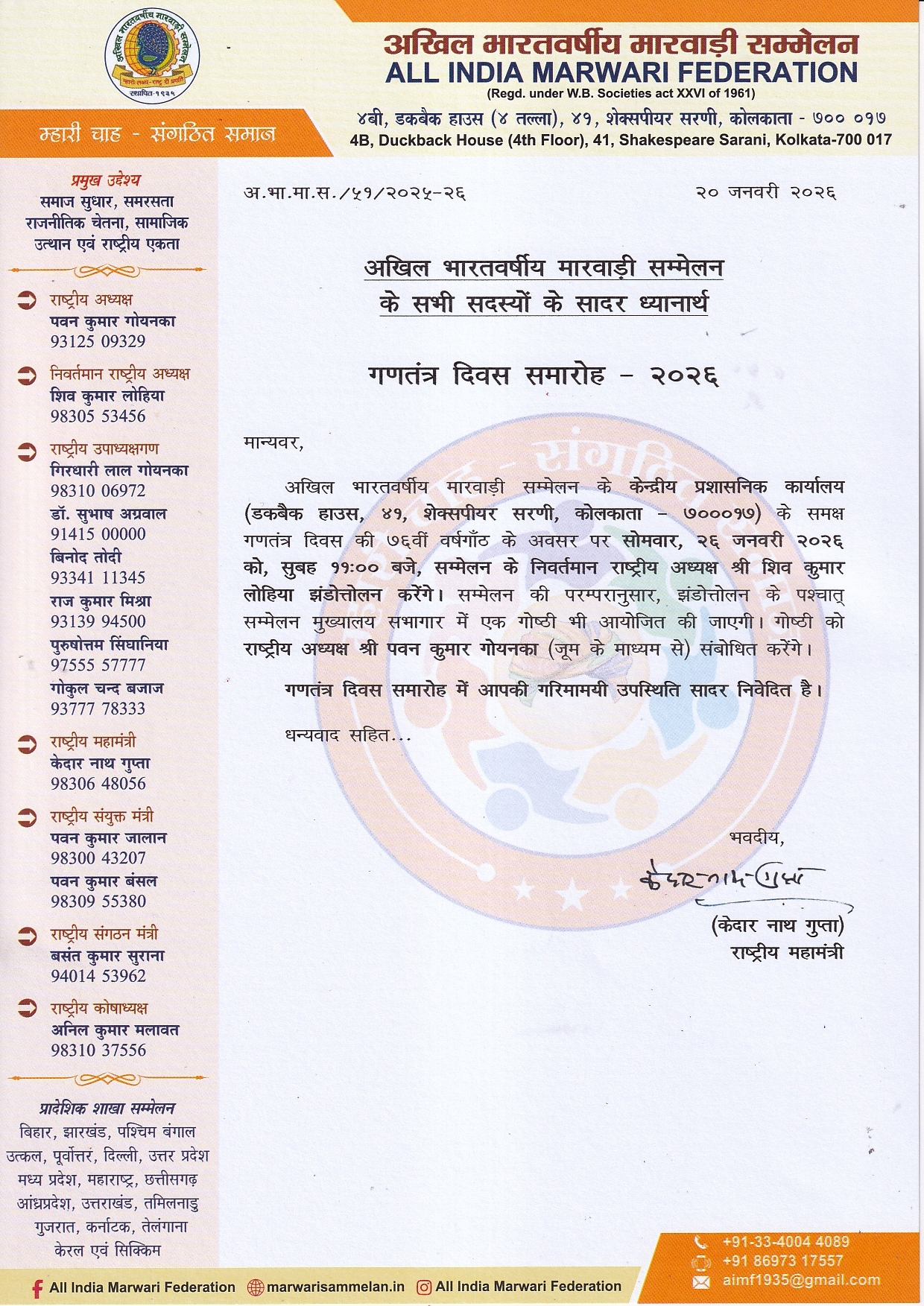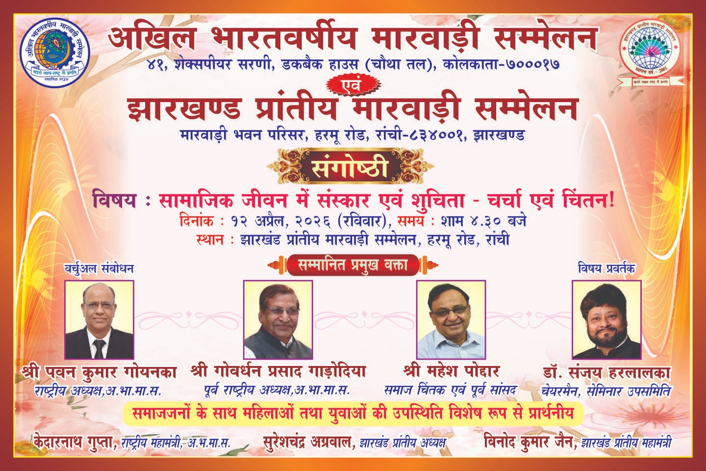 91st Foundation Day ceremony will be held on 25th December 2025 (Thursday) by All India Marwari Federation. Your gracious presence, alongwith family and friends, is solicited.